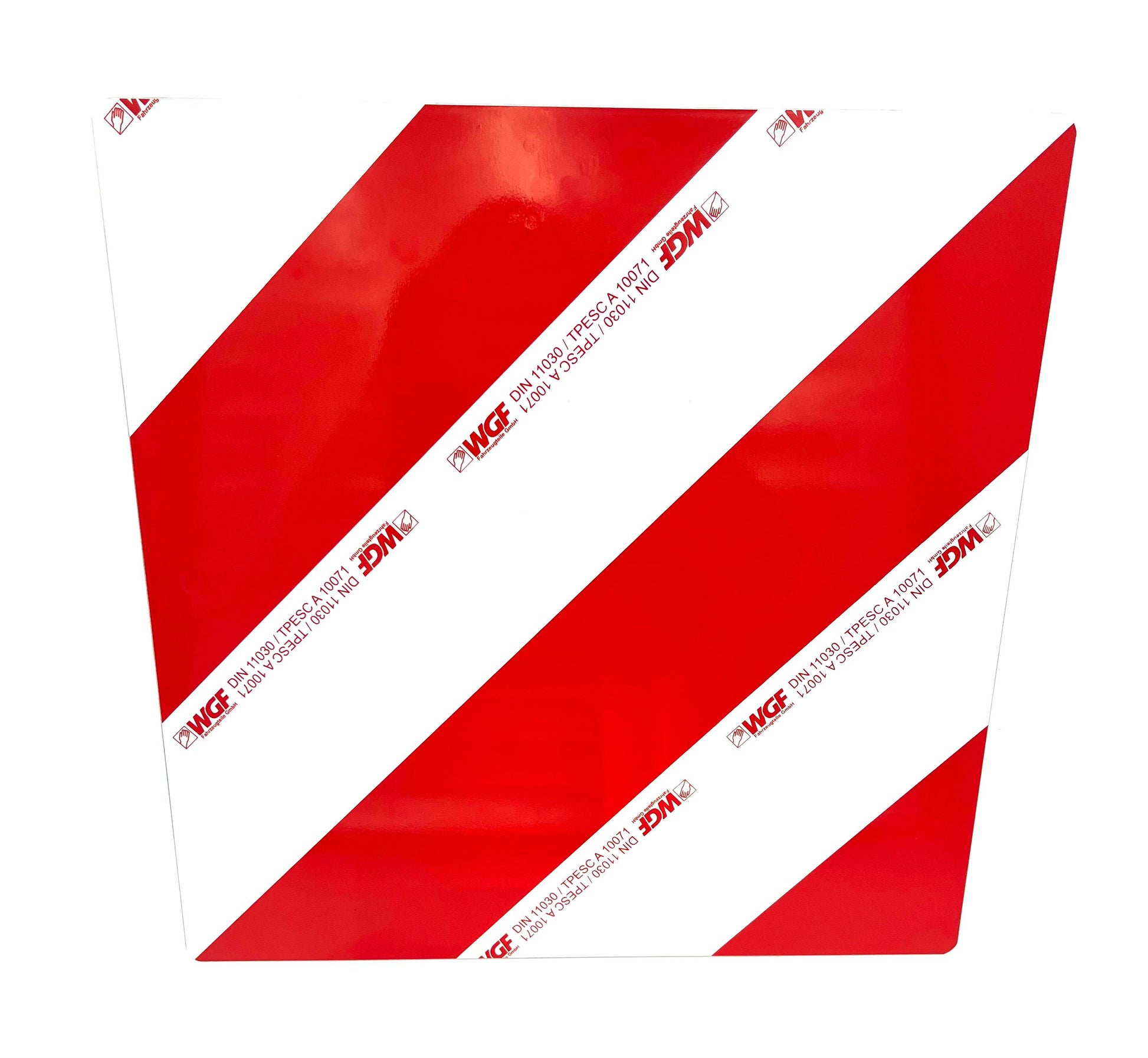 Die Warntafel nach DIN 11030 ist ein robustes und gut sichtbares Sicherheitszeichen zur Kennzeichnung von Fahrzeugen und Maschinen mit überstehenden oder breiten Lasten. Gefertigt aus verzinktem Stahlblech und mit retroreflektierender Signalfolie (Typ 1) versehen, sorgt sie für maximale Erkennbarkeit bei Tag und Nacht.